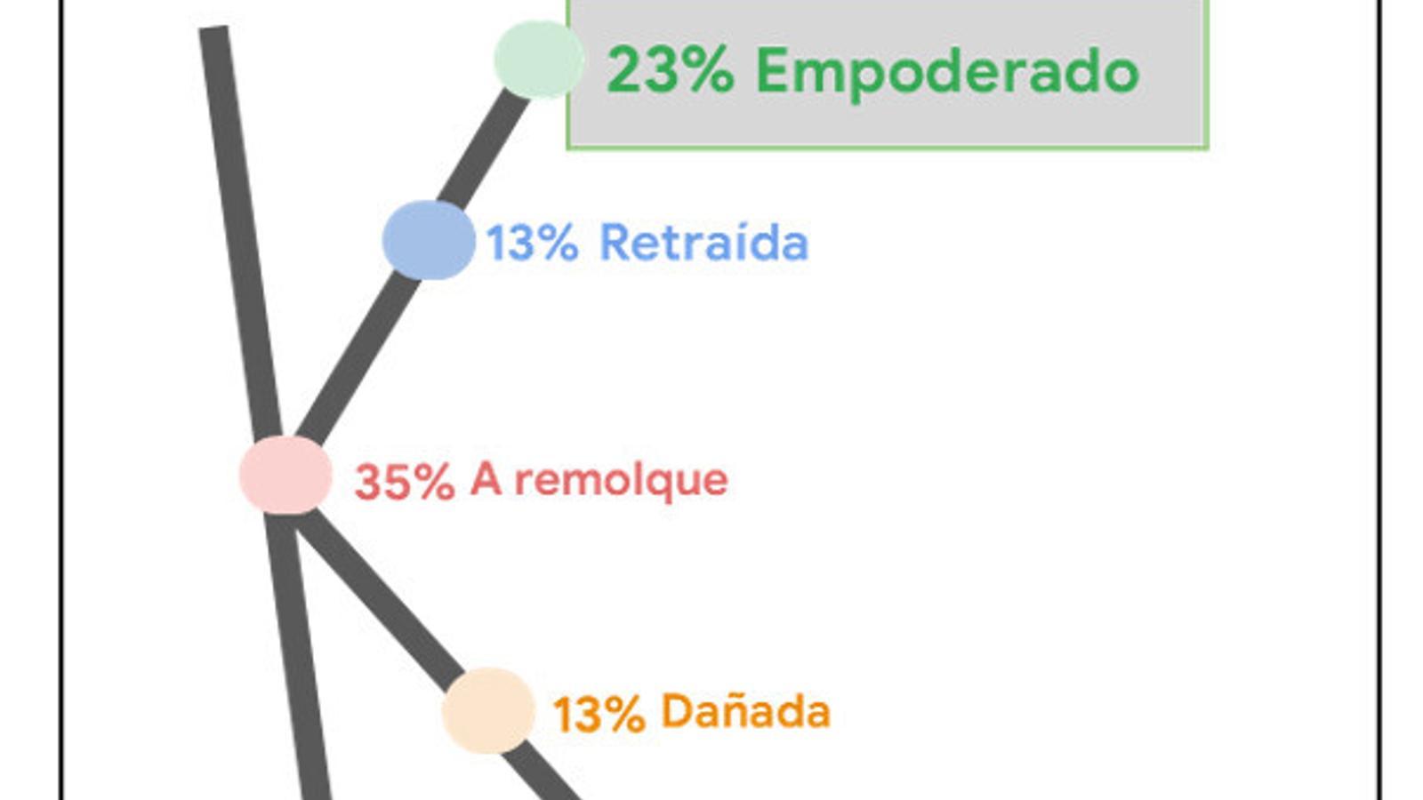Es interesante destacar que los dos grupos que ocupan la parte alta de la K (aquellos perfiles que se benefician de cambios estructurales asociados a la pandemia: ahorro, teletrabajo, digitalización, mejora de sus hogares), denominados 'empoderados' y 'retraídas' comparten esa mejora de condiciones, pero son diferentes en dos aspectos críticos: