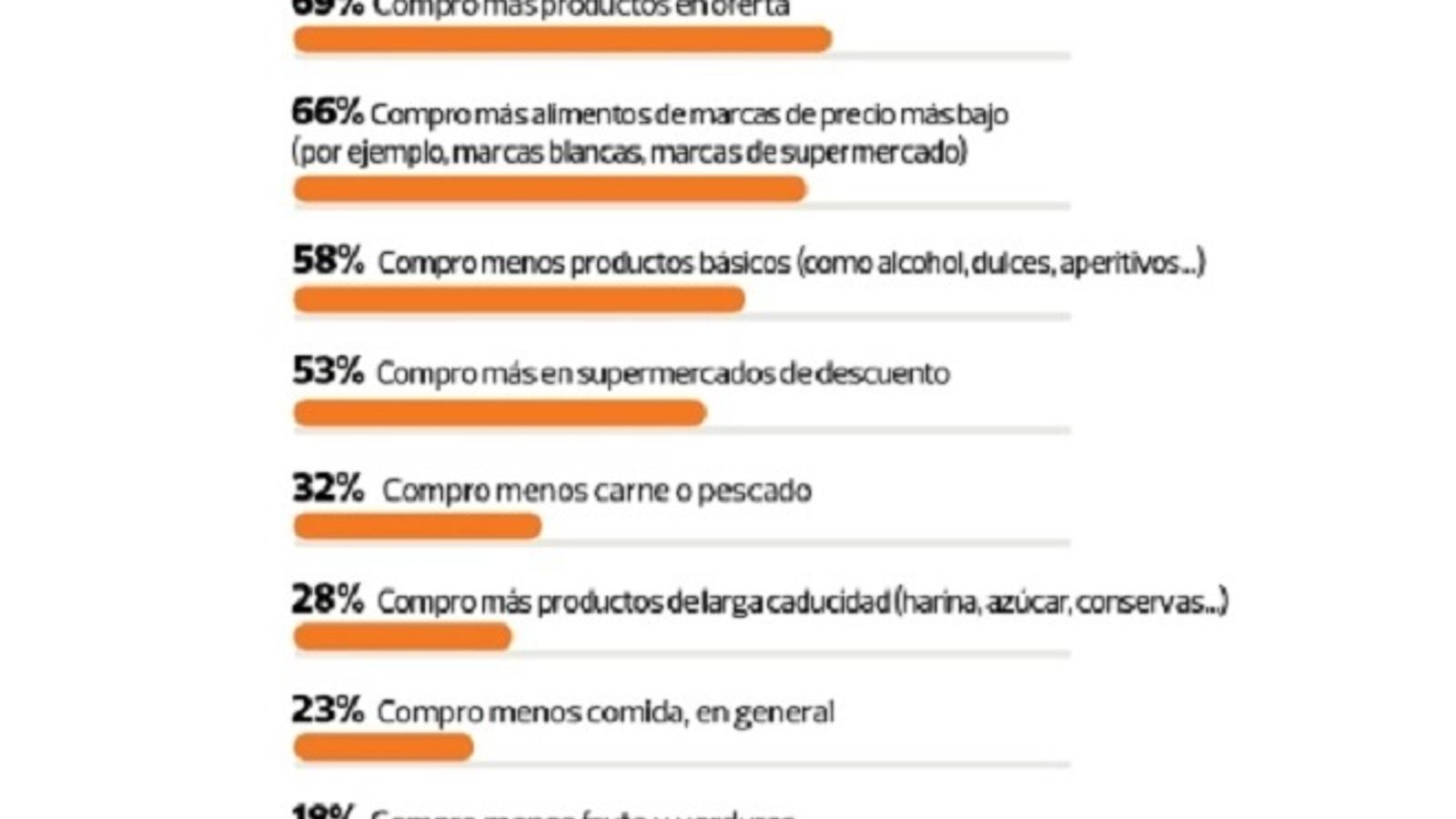 En concreto, 3 de cada 10 usuarios compran menos carne o pescado; el 18% menos fruta y vegetales; el 23% menos comida en general; 2 de cada 3 compra ahora más productos en oferta, o más marcas blancas; y más de la mitad de los usuarios compra ahora más en supermercados descuentos o low cost.