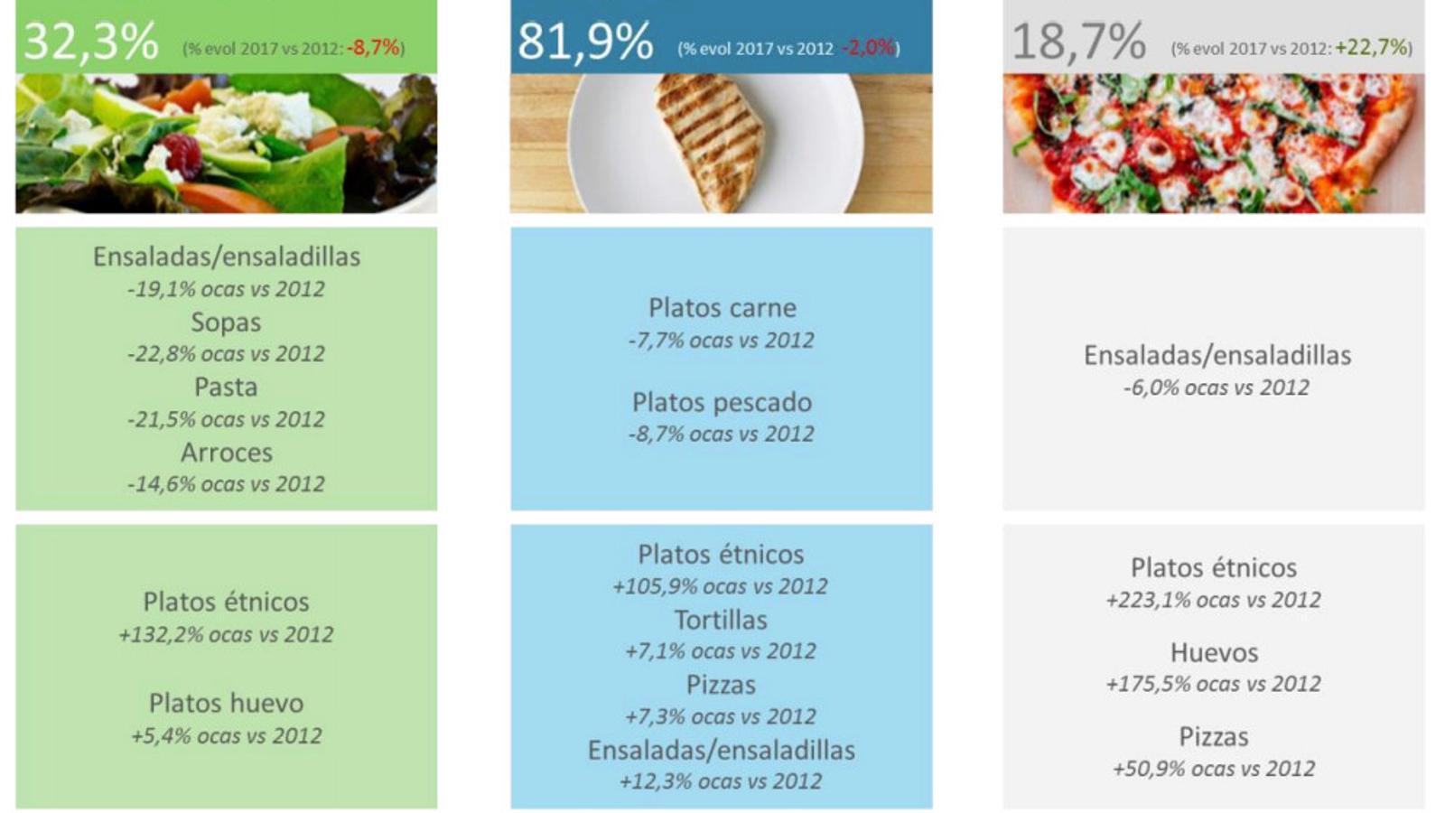 En concreto, los platos principales que están creciendo, según el informe, son étnicos, tortillas o pizzas así como las ensaladas/ensaladillas que pasan de ser un entrante o primer plato a plato principal, es decir, los platos cambian de rol y se adaptan a las nuevas formas de consumo. Los platos étnicos, pizzas y huevos o tortillas se incrementan como platos para compartir y como entrantes y primer plato.