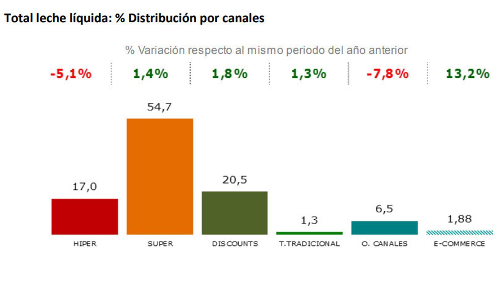 El 92,2% de los litros de leche líquida se adquieren dentro del canal dinámico, es decir, hipermercado, supermercado y autoservicio, y tienda descuento, si bien su evolución fue positiva en 2017, con un incremento del 0,7% en comparación con 2016. El informe atribuye esta subida al aumento de compra en supermercados y tiendas de descuento. Sin embargo, la compra en hipermercados desciendió el 5,1%.