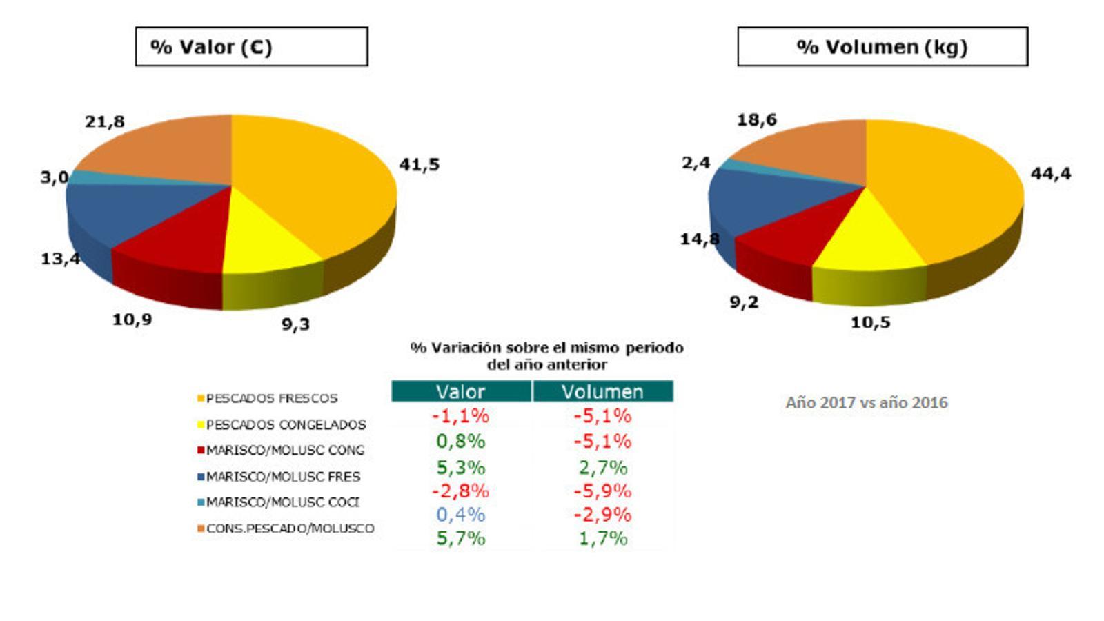 El consumo doméstico de pescado en España se ha reducido progresivamente en los últimos ocho años. Salvo el consumo de conservas, los demás ven reducida su compra de forma gradual en el largo plazo, especialmente en el caso de pescados frescos y mariscos. En 2017, la caída fue del 3,3% respecto al año 2016, hasta alcanzar los 1.082 millones de kilos. Sin embargo, en términos de valor aumentó ligeramente (0,9%, hasta casi los 9.000 millones de euros) debido al incremento en el precio medio del 4,4%, situándose en 8,29 €/kg.