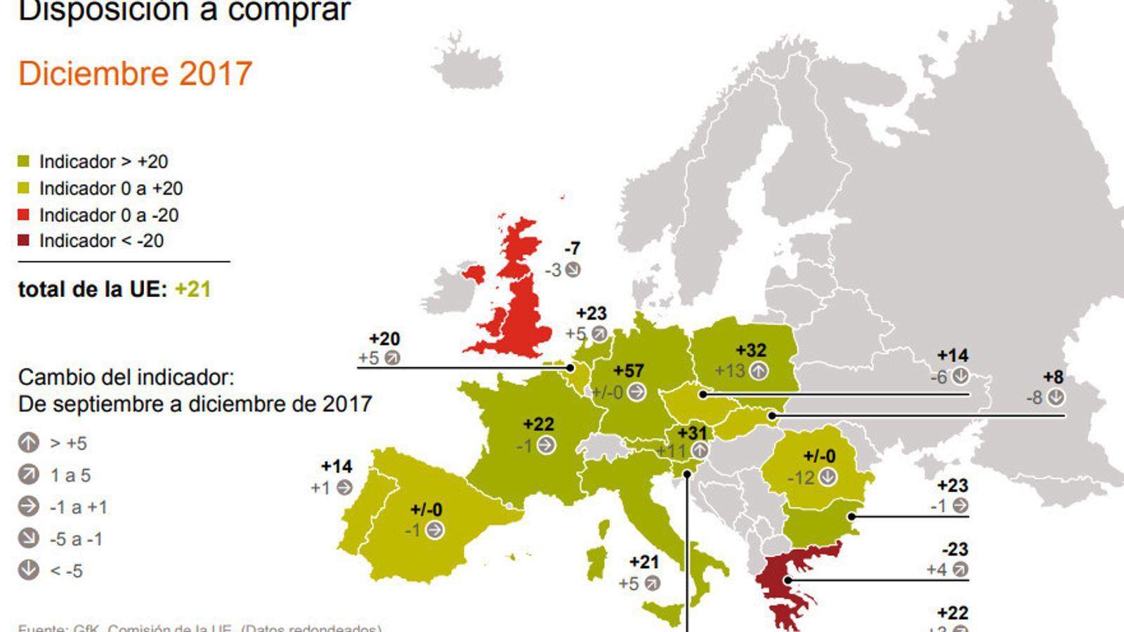 "En 2017, la confianza en el crecimiento económico de Europa ha aumentado significativamente. Debido a este aumento, las personas también esperan mayores salarios. Las expectativas de ingresos son positivas, pero solo ligeramente más altas en comparación con 2016. Lo mismo se aplica a la propensión a comprar. Con base en éstos y otros factores analizados, GfK prevé un aumento en el gasto de los hogares en la Unión Europea de un 1,5% a 2% en términos reales para 2018. Por lo tanto, la economía europea continuará siendo respaldada por el consumo privado", pronostica el experto en consumo de GfK, Rolf Bürkl.