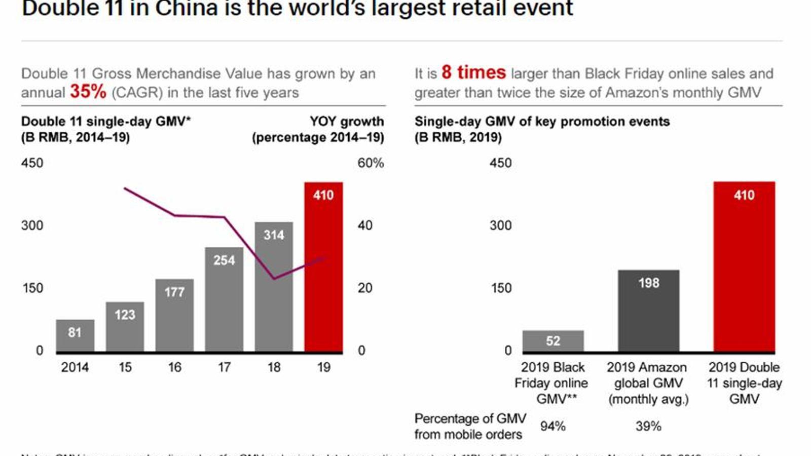 1.- En los últimos cinco años, las ventas en el período de 24 horas del Día del Soltero han crecido el 35% anual, generando 410.000 millones de renminbi (aproximadamente 60.000 millones de dólares o 51.000 millones de euros) en valor bruto de mercancía (GMV), el doble de lo que Amazon genera en un mes completo y ocho veces más que las ventas online registradas en Black Friday. Esto lo convierte en el evento de ventas anual más grande del mundo.