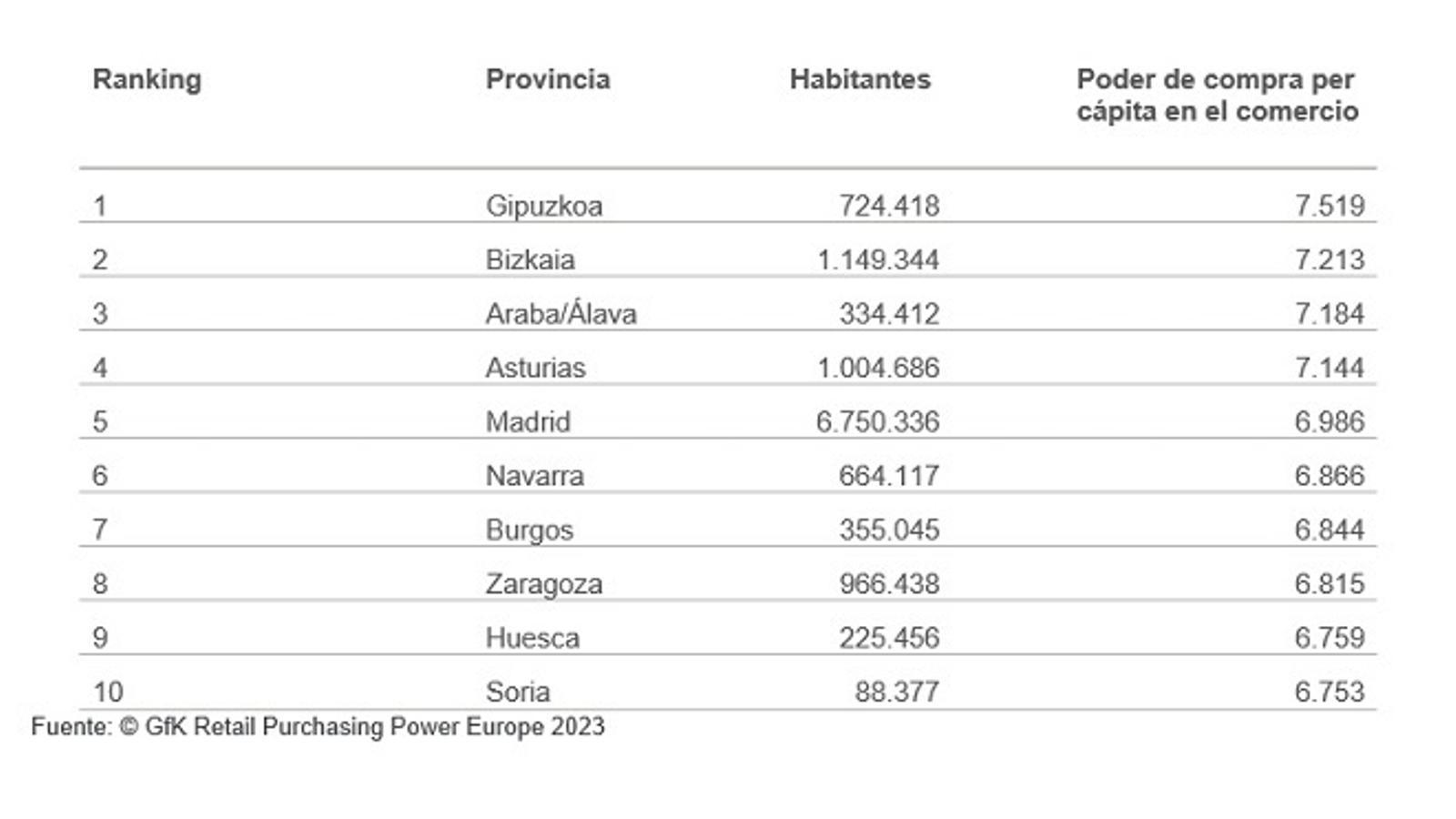 Al analizar en detalle los datos de España, se observan importantes diferencias entre regiones, al igual que en el resto de los países. Este año las provincias con mayor capacidad de compra en tiendas son Guipúzcoa, Vizcaya y Álava.