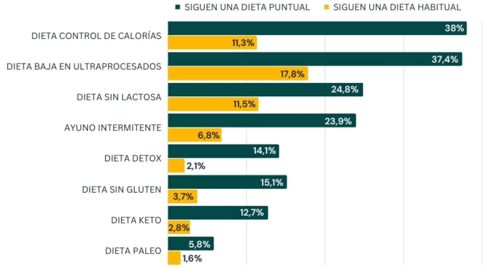 , que evita los ultraprocesados, es la que más seguidoras reúne (44%), seguida de la de control de calorías (42%). Por último el 26% practica el ayuno intermitente y casi un 20% la dieta Detox.