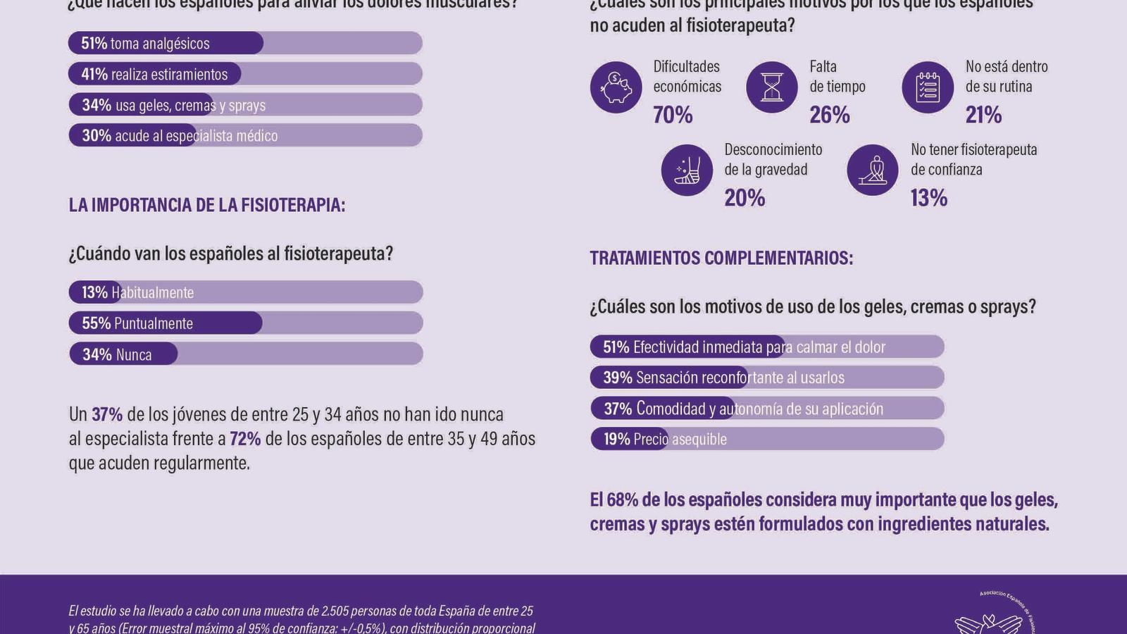 Para aliviar y calmar las molestias y dolores musculares, la mitad de los españoles recurre a los analgésicos, pese a considerar que se debería reducir su uso. Un 34% se decanta por geles y sprays y un 30% acude al especialista médico. "En la actualidad, en general existe todavía un gran desconocimiento sobre los beneficios que la fisioterapia aporta en la salud muscular. Los deportistas son el grupo de población que más frecuentemente recurre al especialista para prevenir y tratar lesiones. Es importante concienciar a la población de la importancia del tratamiento fisioterapéutico para aliviar el dolor, mejorar tanto la fuerza muscular como la movilidad, prevenir y controlar el deterioro físico o mejorar las funciones básicas del organismo", comenta Fernando Ramos.