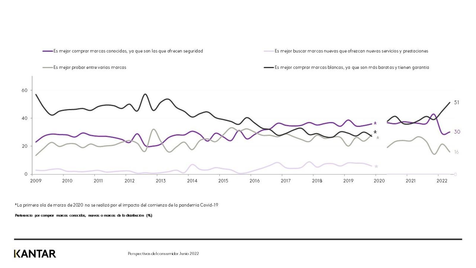 El encadenamiento lógico ante estas expectativas sobre los precios lleva a un incremento de la idea de que es mejor comprar marcas de la distribución, llegando a niveles similares a 2012-2013. Paralelamente observamos un descenso similar de las marcas de los fabricantes en una reacción típica ante las crisis: el retorno a marcas percibidas como más baratas, que al mismo tiempo tienen la garantía de las cadenas de distribución.