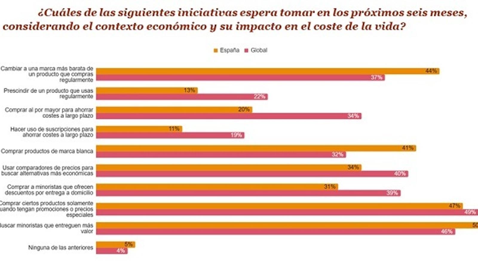Como consecuencia de esta inquietud, los consumidores están alterando sensiblemente sus hábitos de compra. Para empezar, el 53% -el 65% de los españoles- ha reducido el presupuesto que dedica al consumo de productos no esenciales y el 15% -13% en España- lo ha parado completamente. Pero, además, para poder ajustar su renta disponible a la evolución de los precios en los próximos seis meses tienen previsto explorar otro tipo de hábitos. Por ejemplo, comprar solo ciertos productos cuando estén en promoción o cuando exista una oferta especial (49% globales/47% españoles), buscar otras marcas alternativas más baratas de artículos que compran habitualmente (37% globales/44% españoles) o acudir a las marcas blancas (32% de los globales/41% españoles).