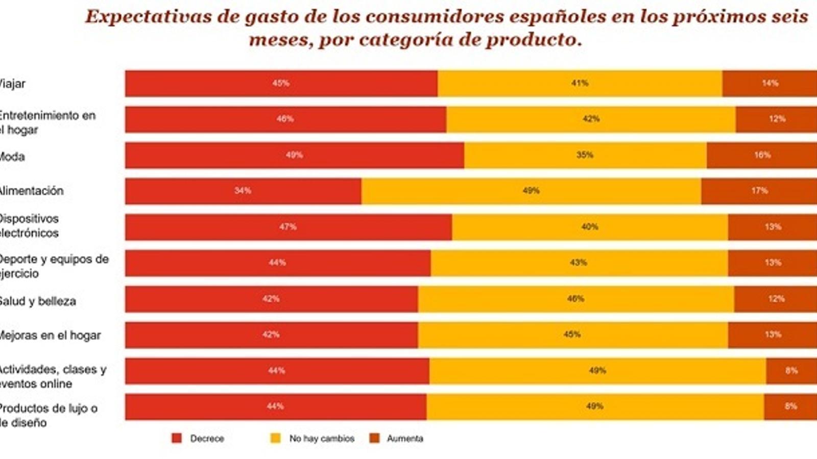 Los resultados de la encuesta muestran que la mayoría de los consumidores espera reducir sus gastos en prácticamente en todas las categorías de productos en los próximos meses. Las más afectadas, lógicamente, son las de lujo, moda y viajes. Y, las menos, las que tienen que ver con la alimentación. En el caso de los consumidores españoles, esperan reducir sus gastos en moda (49%), en productos electrónicos (47%) y en entretenimiento en el hogar (46%). Cuando hablamos de alimentación, la proporción de los que piensan disminuir lo que habitualmente dedican a este capítulo se reduce al 34%.
