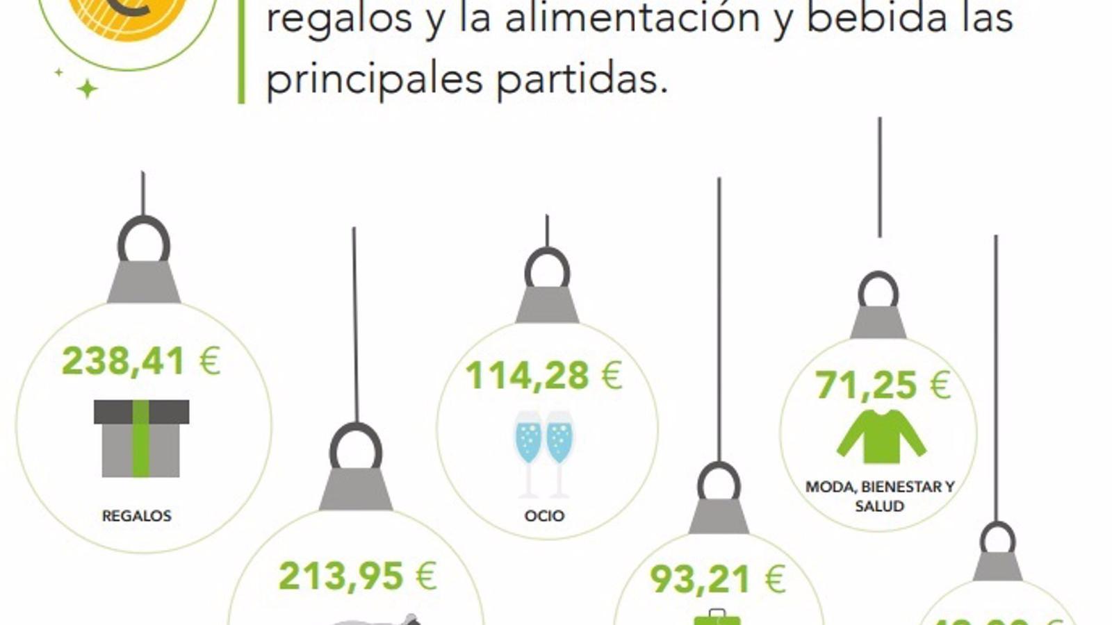Los españoles tienen la intención de gastar de media 779 euros durante estas fiestas, siendo los regalos, y la alimentación y bebida las principales partidas, con 238 y 214 euros, respectivamente según revela un estudio elaborado por IO investigación para la compañía de financiación Oney.
