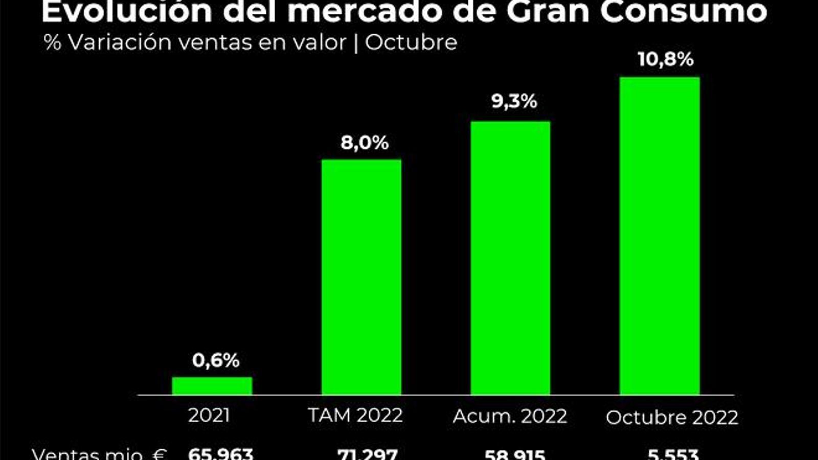 Sin embargo, la escalada de precios continúa y así en el total de bienes de consumo se registró un alza en los precios en octubre del 11,5% respecto al mismo periodo del año anterior, pero similar a la cifra obtenida un mes antes (11,1%), con un ligero retroceso del volumen del 0,6%, frente al año anterior.