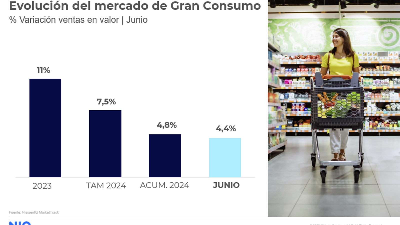 Patricia Daimiel, directora general de NIQ Iberia, ha manifestado que "volvemos a sumar un mes más de volúmenes en positivo en el mercado del gran consumo, lo que afianza esta tendencia que se viene registrando durante todo 2024, a pesar de que no hemos constatado, por ejemplo, un aumento destacado de categorías asociadas al momento de los partidos de fútbol en la Eurocopa como aperitivos o cervezas, veremos si la inminente celebración de los Juegos Olímpicos sigue esa misma tendencia".