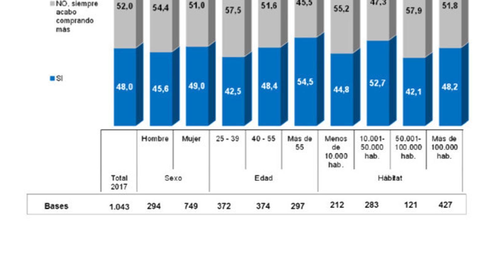 Según el hábitat, las poblaciones entre 10.001 y 50.000 habitantes son las que en mayor medida se atienen a su lista de la compra (52,7%) mientras que las que tienen entre 50.000 y 100.000 habitantes son las que menos lo hacen (42,1%).