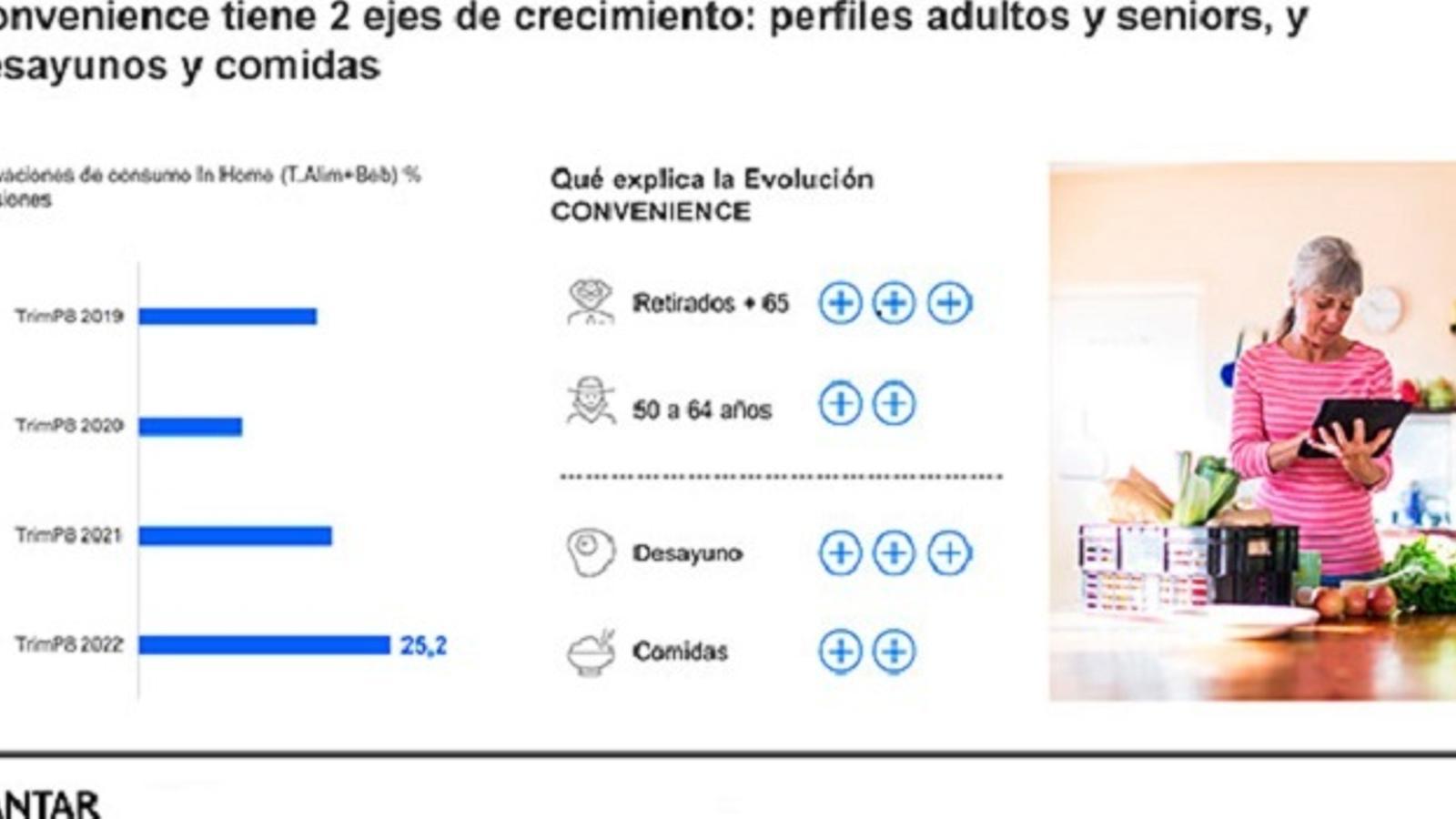 El porcentaje de consumidores que usa ingredientes pre-elaborados que le ayuden a ahorrar tiempo cocinando va en aumento y la mitad de los encuestados están dispuestos a pagar más por productos que les hagan la vida más fácil. Esta tendencia, llamada convenience, tiene dos ejes de crecimiento: perfiles adultos y seniors (que no empezaron siendo el target), por un lado, y desayunos y comidas, por el otro.