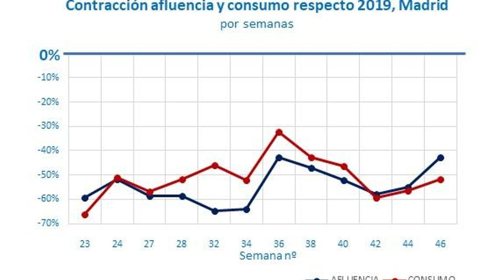 Este análisis indica que la capital españolas mantuvo contenido el consumo con el mismo dato de octubre, pero frenando su "fortísima caída", a la vez que se produjo una gran recuperación de la afluencia de público en todas las zonas. Además, todas las tendencias, tanto de afluencia como de consumo en las seis zonas de Madrid, son positivas con respecto a octubre, con la única excepción del consumo en las zonas de oficinas, que cae unos escasos cuatro puntos.
