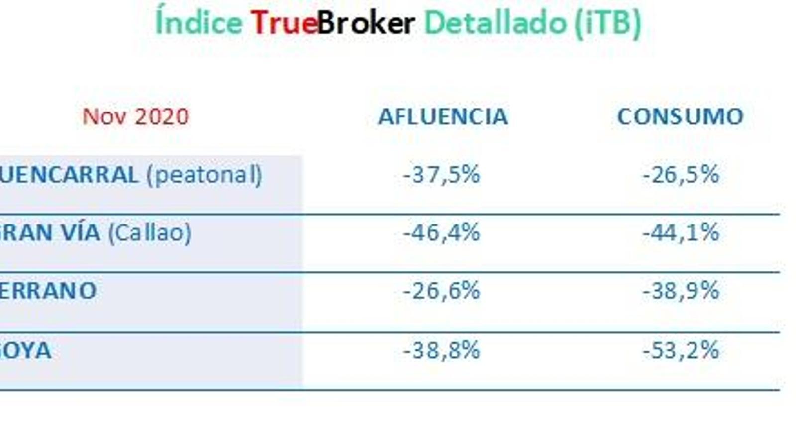 Al frente de la recuperación del consumo, con respecto a noviembre del 2019, se encuentran los barrios Singulares (-21% en Madrid), la calle Fuencarral (-26% en la zona centro), y la calle Serrano (-39% en el barrio de Salamanca). La calle Goya, con una "fortísima caída del consumo" (-53%), pierde por primera vez durante la pandemia el liderazgo del consumo en el barrio de Salamanca.
