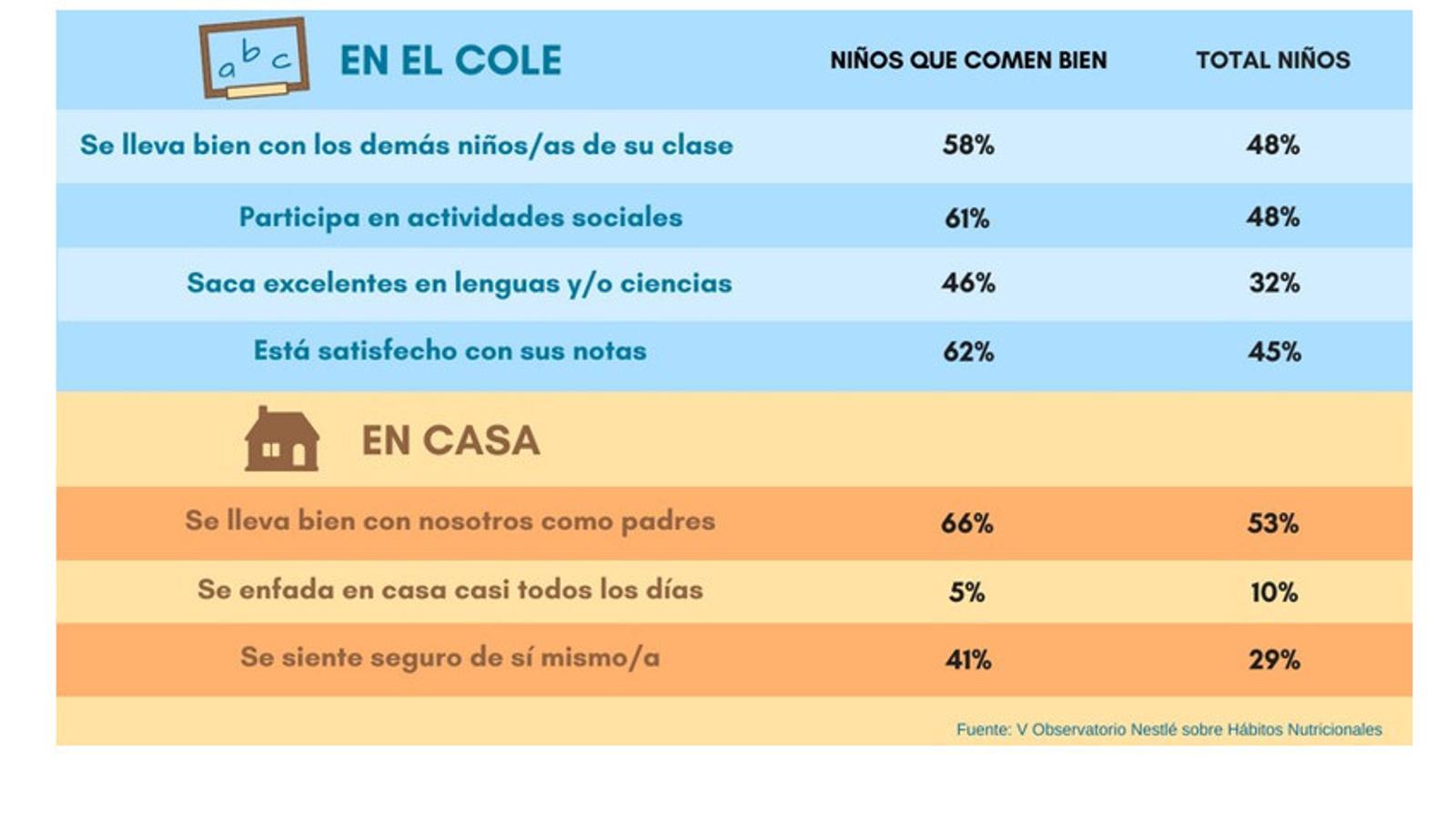 Según los mismos, los niños que comen bien tienen más confianza en sí mismos, un 41% frente al 29% del total y, además, se enfadan menos en casa. Mientras el 10% de los niños españoles tiene riñas familiares casi todos los días, solo el 5% de los que comen de forma equilibrada se enfada con sus padres a menudo.