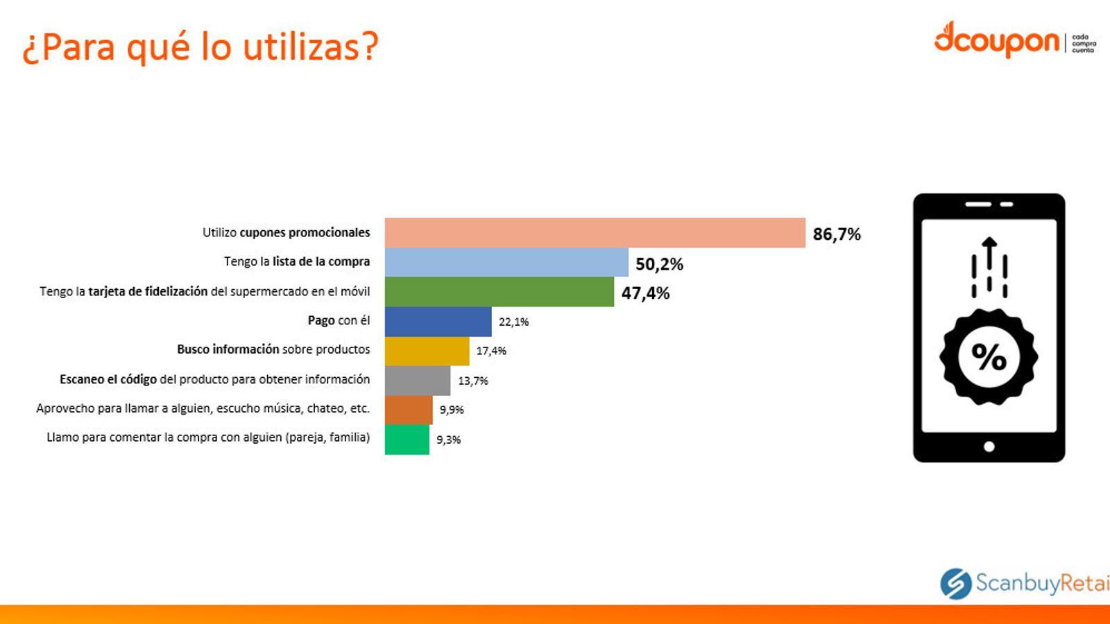 Asimismo, el 81% utiliza el móvil en el supermercado y el 86,7% lo emplea para hacer uso de cupones promocionales, seguido del 50,2% a los que le sirve para llevar la lista de la compra. El 47,4% lleva en este dispositivo la tarjeta de fidelización del establecimiento y el 25,9% utiliza la propia app de descuentos del supermercado.