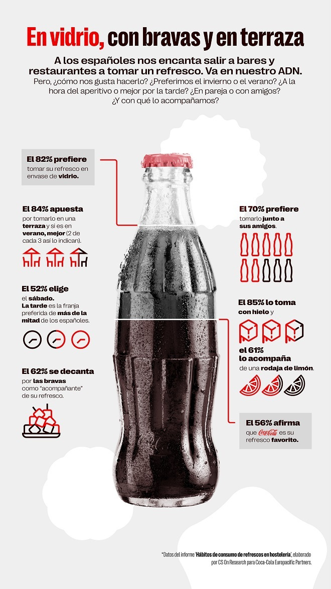 La ciudad es el mejor lugar para consumir refrescos (66%), preferiblemente en compañía de amigos (70%) y junto a unas patatas bravas (62%). Y siempre, en envase de vidrio (82%). Así lo revela estudio 'Hábitos de consumo de refrescos en hostelería', elaborado por CS On Research para Coca-Cola Europacific Partners.