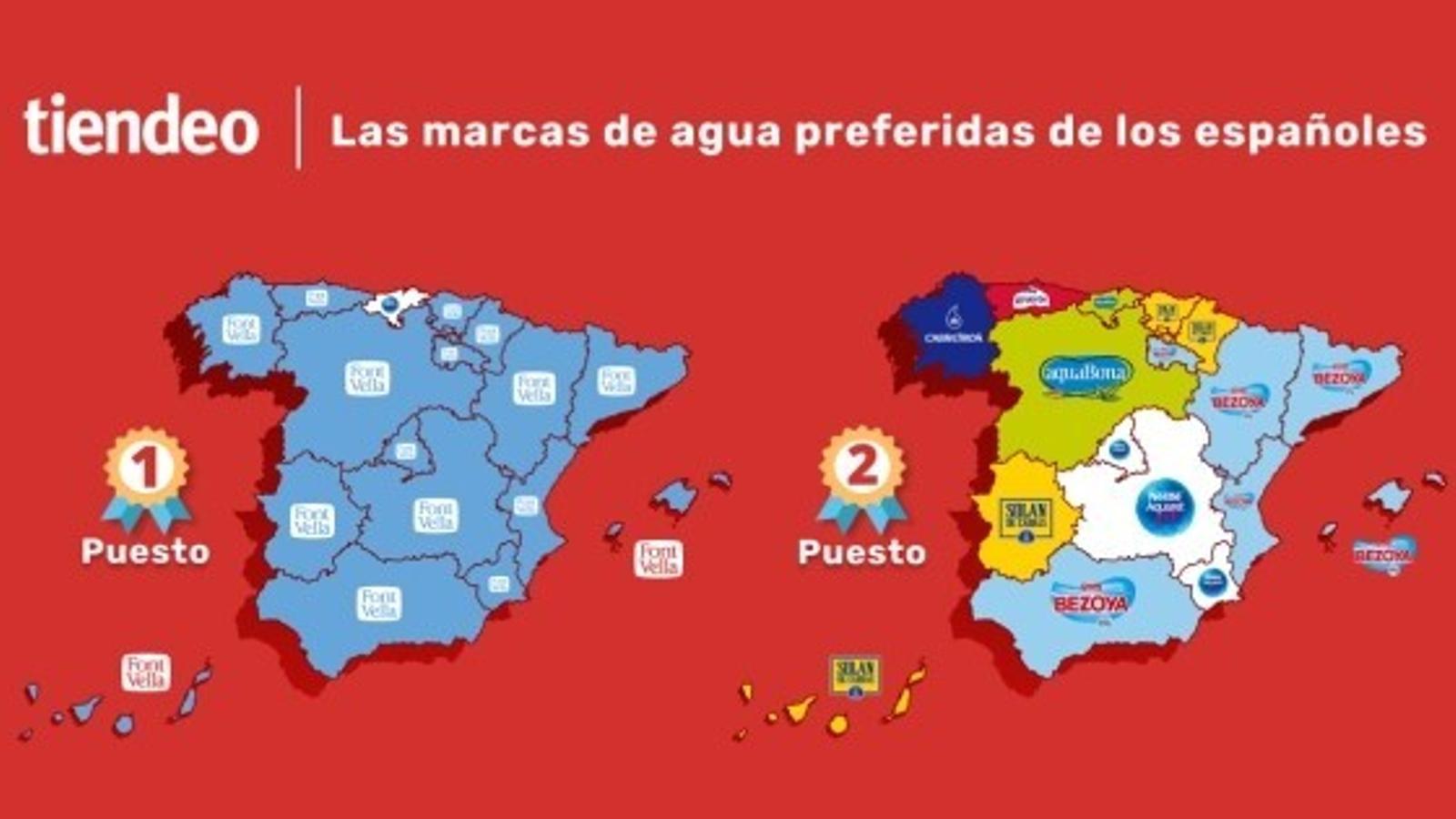 En la categoría de agua, Font Vella es la más buscada en toda España y domina el ranking en todas las comunidades autónomas a excepción de Cantabria (dónde domina Aquarel), registrando un índice de búsqueda del 19,8%. Bezoya, con el 11,9% de las búsquedas, ocupa el segundo lugar del ranking nacional, seguida de Aquarel, cuyas búsquedas ascienden al 11,1%.