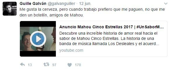 Guille Galván, de Vetusta Morla, ha sido de los más críticos. En su cuenta de Twitter, por ejemplo, ha comentado: "Me gusta la cerveza, pero cuando trabajo prefiero que me paguen, no que me den un botellín, amigos de Mahou. Luego nos extrañamos de que la gente no valore el trabajo de los músicos, sus derechos y sus reivindicaciones".