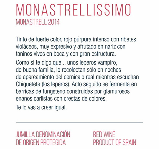 Se ha convertido en los últimos días en el vino más popular de España. No hay red social o grupo de WhatsApp que no haya comentado algo, risas incluidas, sobre su peculiar contraetiqueta antipostureo, la cual se ha convertido en una de las mejores acciones de marketing que se han visto en este 2016. Ahora explicamos las razones... Se trata de Monastrellissimo, un vino de la Denominación de Origen Jumilla, que se vende de forma exclusiva en Viníssimo, una enoteca de San Javier (Murcia) cuyo sentido del humor ha enamorado a (casi) todo el mundo.